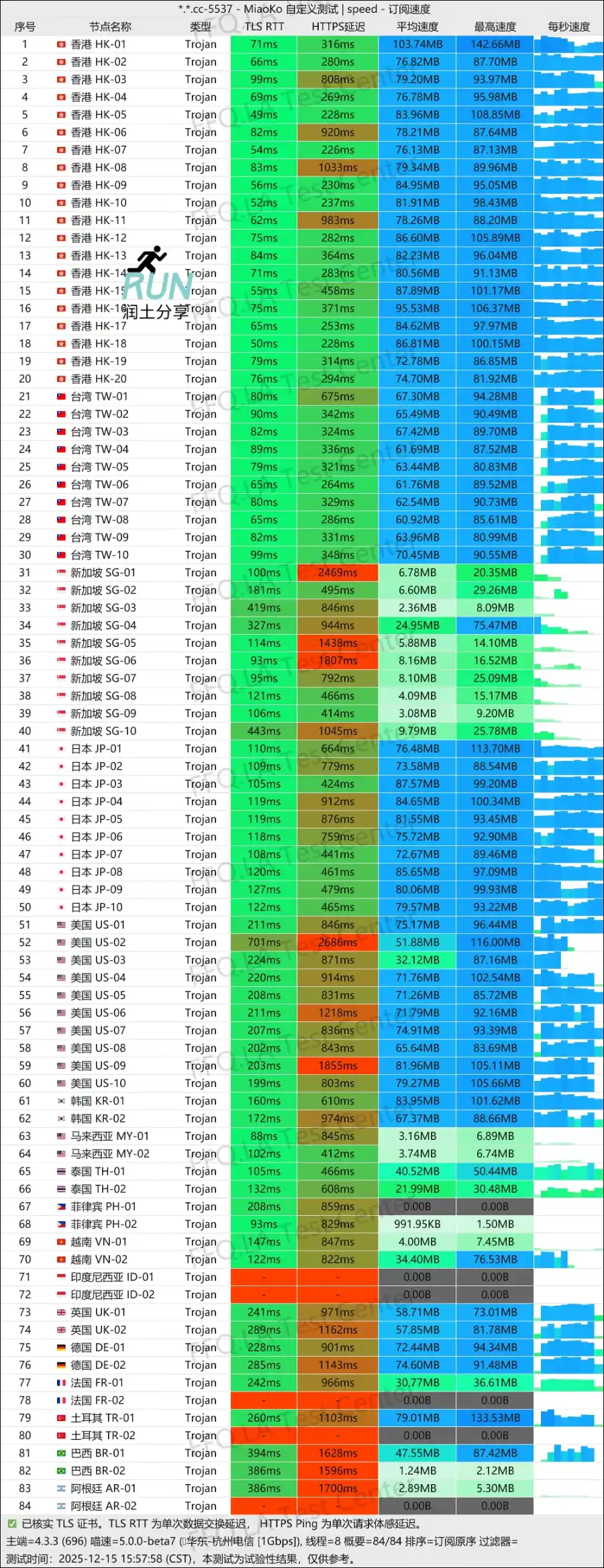 全节点 1 倍率,几大常用地区节点,带宽冗余充足,冷门节点表现则有好有坏。