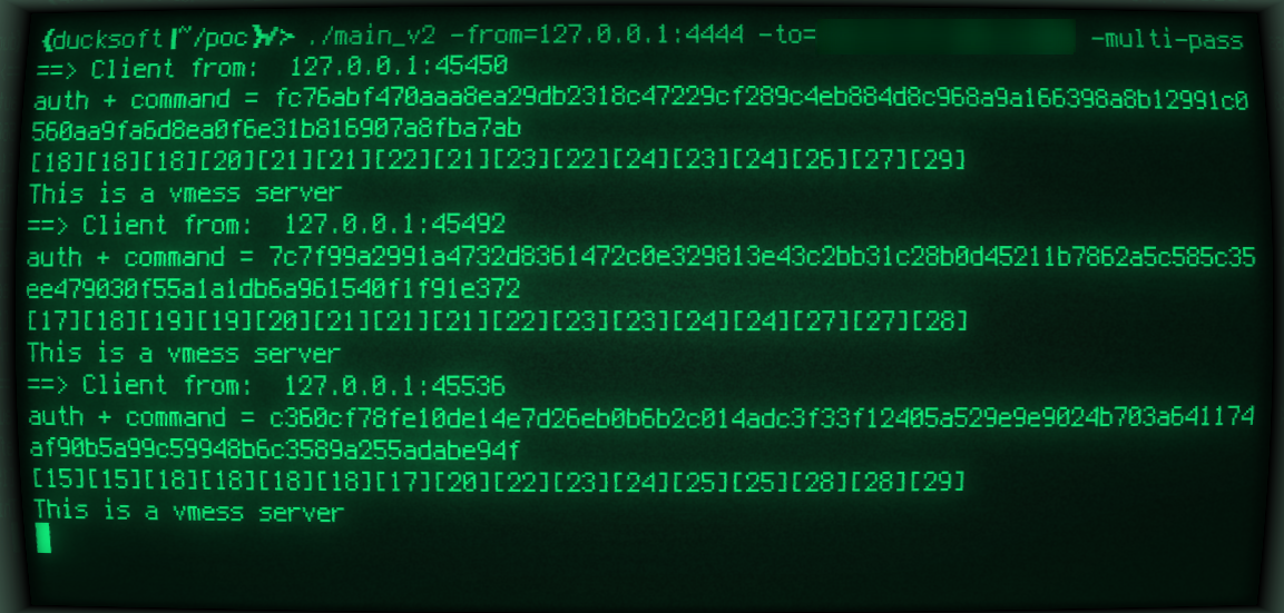 简而言之,如果 GFW 怀疑你在用 vmess+tcp,只需捕获 vmess 数据流中的第一个包,基于此包恶意构造出 16 个衍生数据包,并在 30 秒内发送,即可通过观测服务器的行为,以近乎 100% 的成功率探测出你的服务是否是 vmess + tcp。
