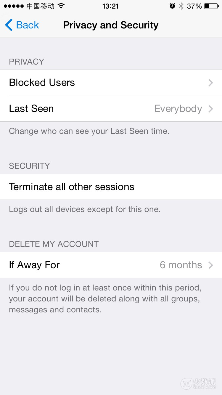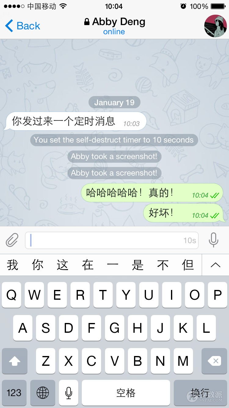 比起其他应用,Telegram 的会话选项多样,除正常会话和刚才提到的陌生人临时会话以外,还有私密会话。在此会话中可以对信息设置阅后即焚计时器,自定义多少时间后销毁信息,尤其是就算对方截屏了应用也会自动提醒这事,简直和微信「对方撤回一条信息」一样温暖人心。