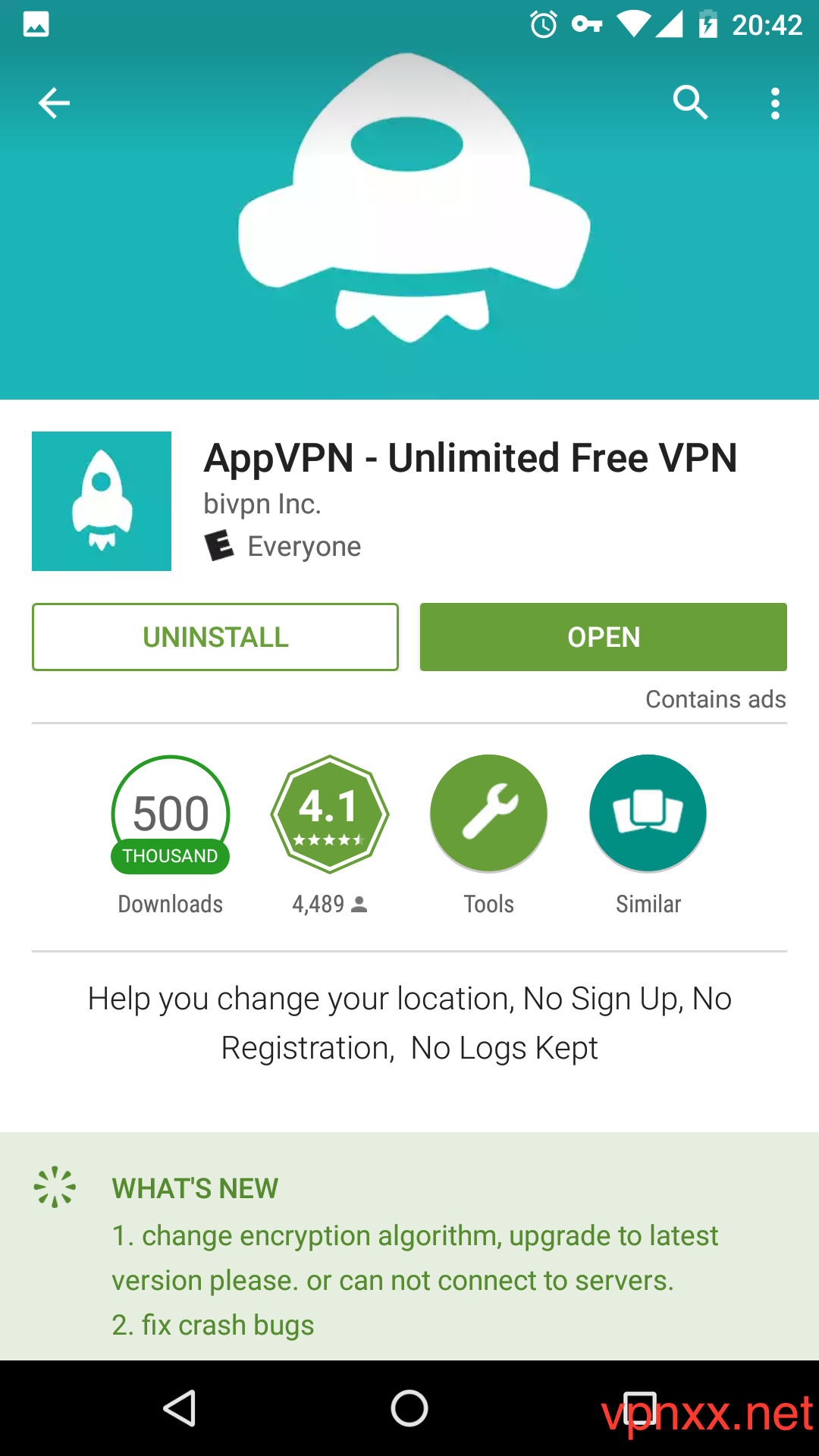App VPN是适用于安卓系统的免费VPN,由Bi VPN公司提供。在Google play商店中,App VPN评分4.1,安装量高达50万+