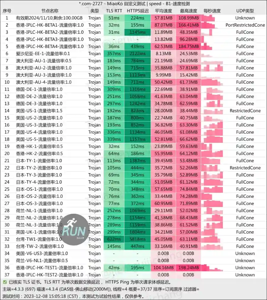 速度表现基本上都令人满意,由于是直连线路,所以延迟普遍偏高。部分节点支持UDP转发。