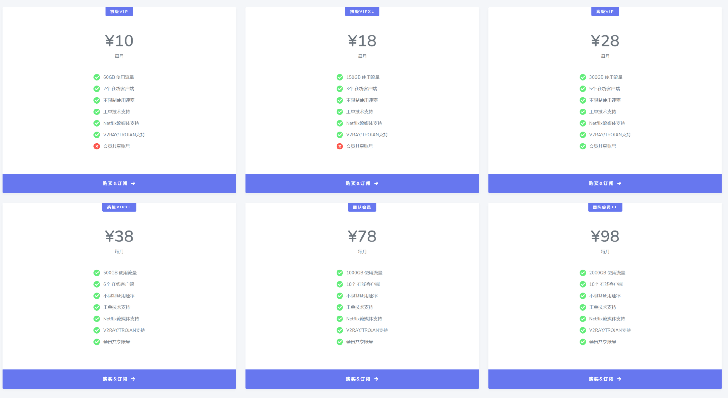 白月光机场套餐均不限制设备数量和速率,除了流量有差异外,使用的节点也不受限制。