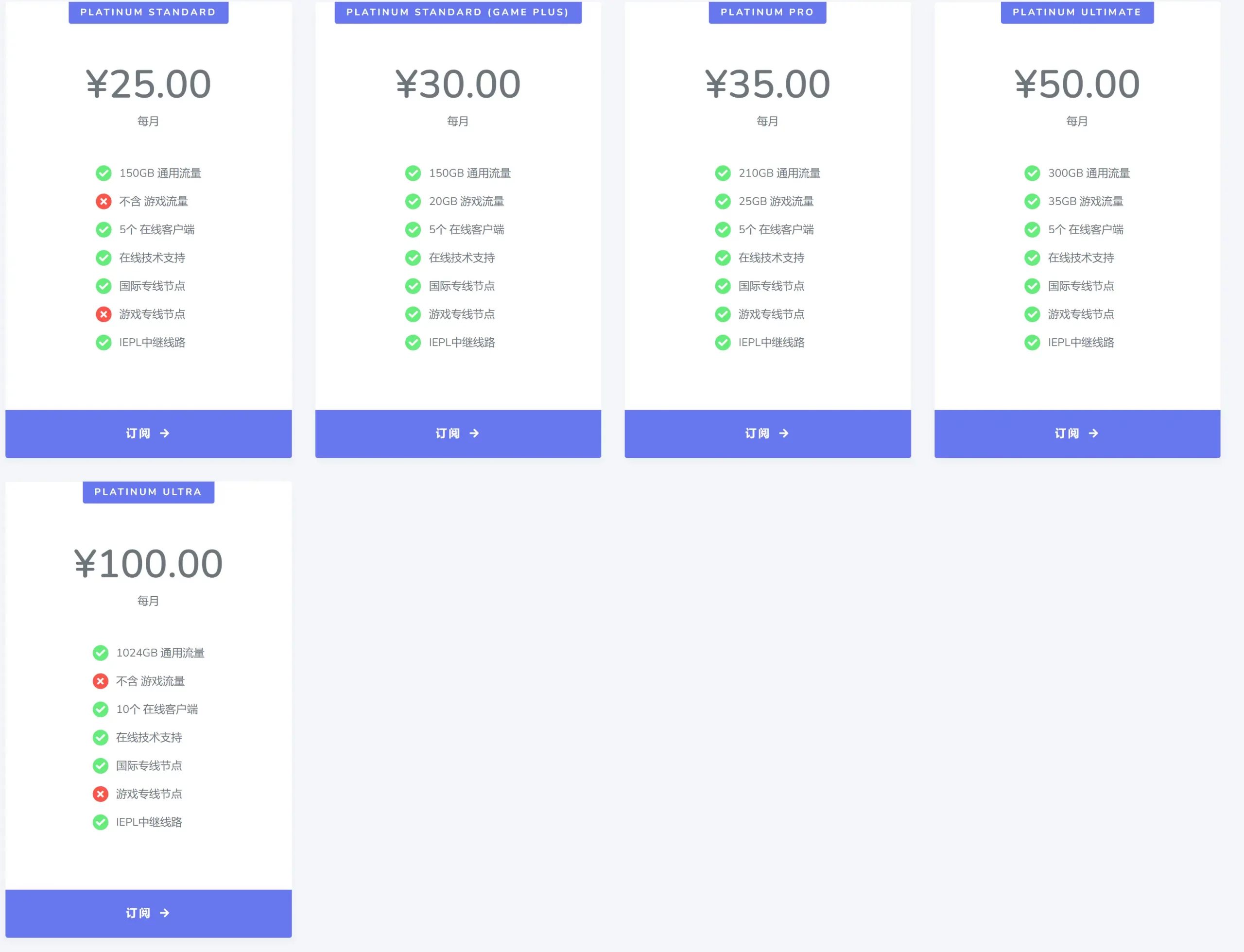 Platinum 套餐:每月 500G 流量,¥435 半年。