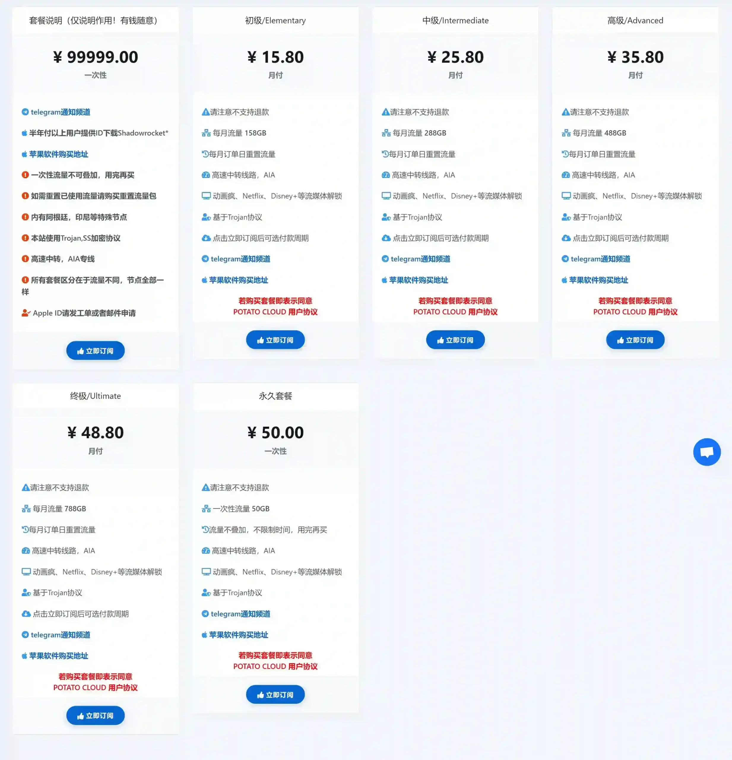 土豆云中转机场,采用 Trojan 翻墙协议,国内接入为移动、联通、电信CN2。支持 Clash、 Shadowrocket 订阅链接。付款方式支持支付宝。针对半年付及以上套餐官方提供 Shadowrocket 小火箭ID,有合作的美区苹果账号发卡网站,可自助购买。